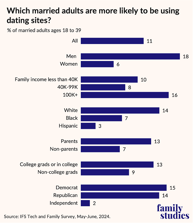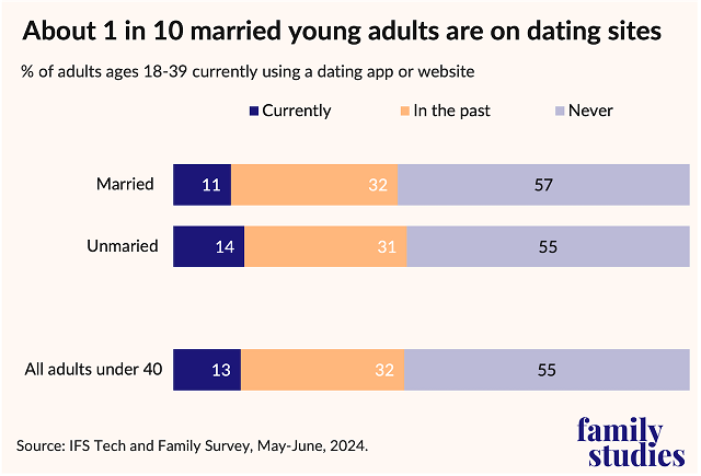 - A surprising 11% of married young adults under age 40 report currently using dating apps or websites, according to a recent Institute for Family Studies/YouGov survey of 2,000 adults ages 18 to 39 Post This