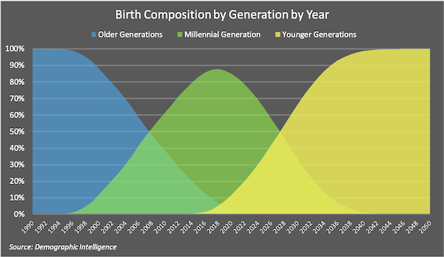 Another way to look at Millennial births is to examine when Millennial women themselves have given birth compared to other Millennials, not other generations. As a generational cohort, Demographic Intelligence predicts that Millennial women will give birth to approximately 75 million children (assuming current birth and immigration trends continue for the foreseeable future). The chart below shows when Millennial women will give birth to these roughly 75 million children.