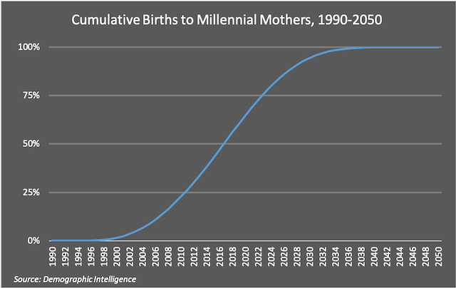 In the 1990s, few Millennial women were of childbearing age, and some of them were not even born yet since the final year of Millennials being those born was 1998. As a result, very few of the children that would be born to this generation were born in the 1990s. In fact, by the end of 1999, Millennial women had given birth to less than 650,000 children (less than 1% of the anticipated 75 million total). However, by the end of 2000, when the oldest Millennials mothers were 19 years old, Millennial women had given birth to about 1.1 million children, but still only about 1.5% of the total number of children they are estimated to have. By 2006, these mothers had given birth to over 8 million children, just over 10% of all the expected births, and it quickly increased from there to just under 20 million children in 2011 (or 19.7 million), which was more than one-fourth of the children they are estimated to ultimately have (26%). Sometime in the latter half of 2017, Millennial women reached the expected midpoint, having given birth to approximately 37.5 million children. What does this mean?