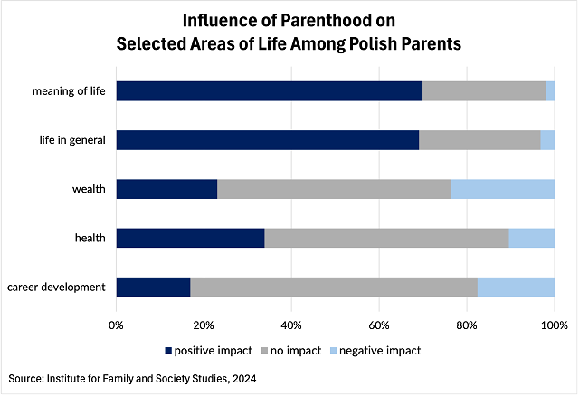 Polish parents say that children make life better—especially in terms of the sense of meaning in life (70%) and life in general (69%). Only 3% claim a negative influence.