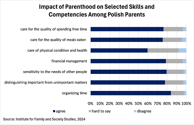The results suggest that the vast majority of Polish parents thrive from having children. According to the majority of respondents, parenting promotes the development of competences and skills in organizing time, distinguishing important from unimportant matters (81%), as well as a greater sensitivity to the needs of other people (79%), and better financial management (79%). Nearly 60% claim that parenthood also fosters greater care of physical condition and health, for the quality of meals eaten (75%), and for the quality of spending free time (76%).