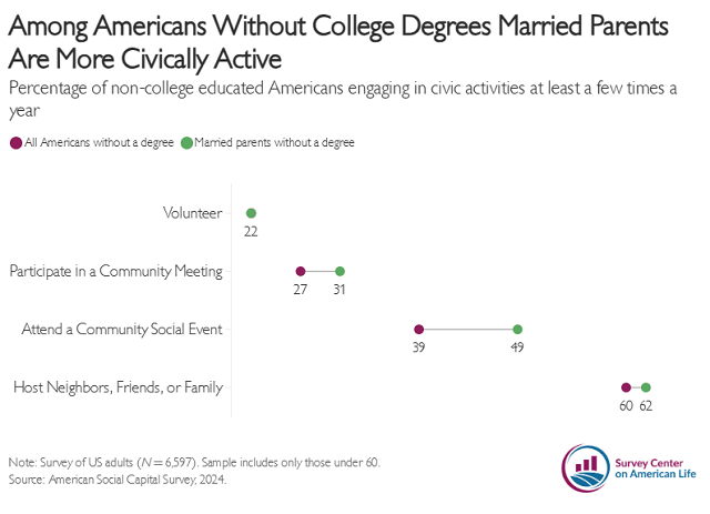 First, half of college-educated mothers (50%) and more than 4 in 10 college-educated fathers (42%) volunteer in their communities at least a few times a year. Additionally, a vast majority (more than 8 in 10) of these same parents said they host people in their home at least a few times a year, compared to only 66% of the general population. More than two-thirds of college-educated parents report attending community events (including high school sporting events or concerts). Parents are consistently more involved in their local community than the average American, shouldering much of our shared responsibility to build and maintain civic life.