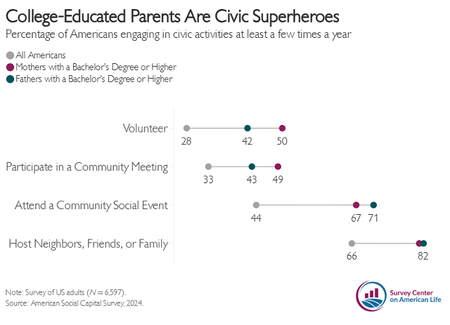 - A recent report from the Survey Center on American Life found that college-educated parents remain very involved in their communities, spending much more time engaged in civic activities than other Americans. Post This