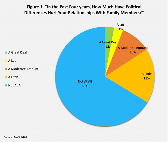 New data from the American National Election Study (ANES), a seven-decade-long survey about campaigns and elections, show that narratives about family political turmoil likely have been vastly overstated. The overwhelming majority of Americans report that political differences in their homes or families have had little real impact on their familial relationships, even if a few cases that did made headlines.