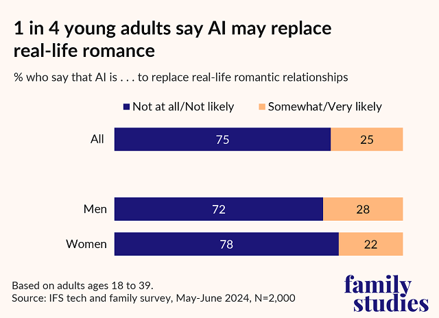 One in four young adults believe that AI girlfriends and boyfriends have the potential to replace real-life romantic relationships, while most (75%) do not see AI as a viable replacement for human partners.