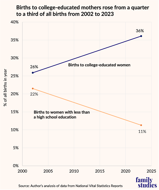 My analysis of birth certificate data shows that the proportion of babies born to college-educated women increased by nearly 40% over the two decades from 2002 to 2023. It rose from one-quarter to more than a third of all U.S. births. Over the same time span, the proportion born to women with less than a high-school education dropped by nearly 50%, from 22% in 2002 to 11% in 2023.