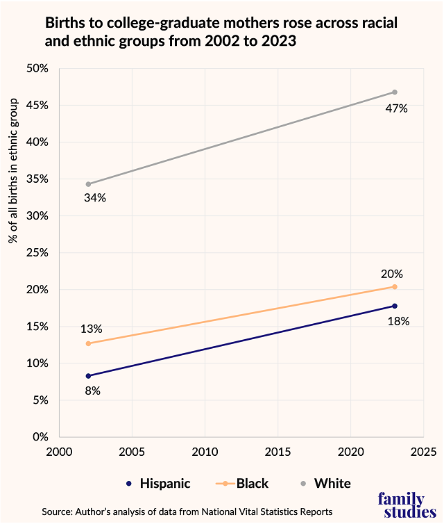 Among white infants, the proportional gain was 36%, from a third of white infants having college-educated mothers in 2002 to nearly half— 47%—having them in 2023.