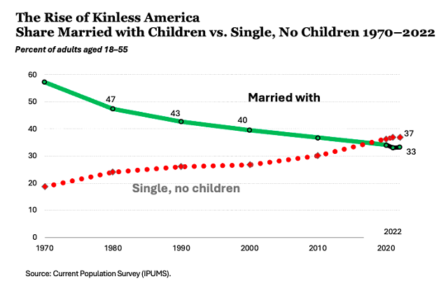 - America has just crossed a historic threshold where, of adults aged 18-55, there is now a greater share of single adults with no children than there are married adults with children. Post This