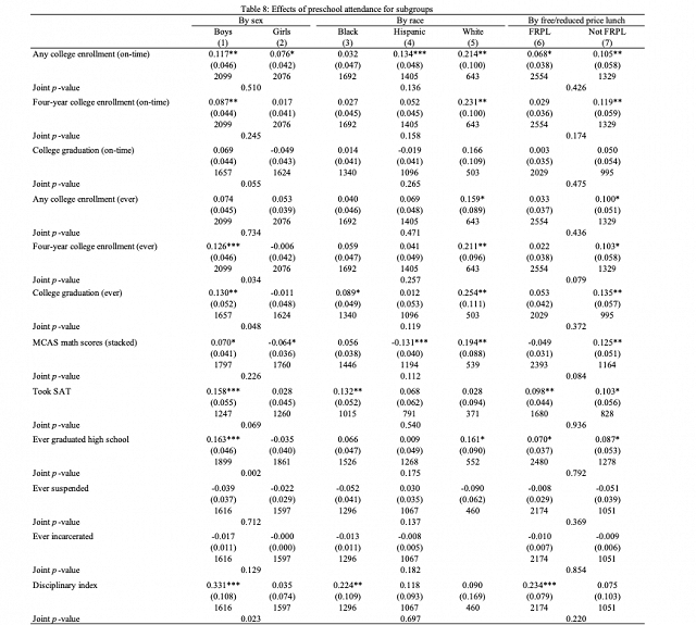 But not this study. To put it somewhat crudely, but also probably more accurately than the authors put it themselves, this study finds that the benefits of pre-K are largely the preserve of affluent white boys.
