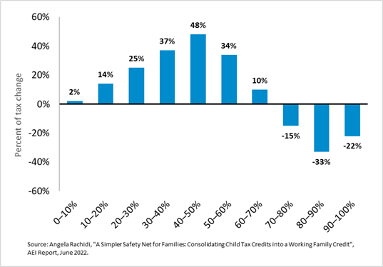 A potential compromise between limited-government and pro-family conservatives might exist if an expanded CTC targeted low-income families better. In a recent proposal, I suggested a consolidated tax credit that would combine the earned income tax credit (EITC) and CTC. Like the Family Security Act 2.0 and Sen. Rubio’s framework, my proposal for a Working Family Credit (WFC) emphasizes the importance of supporting families while also encouraging work, marriage, and personal responsibility. One difference, however, is that the WFC heavily tilts federal expenditures toward the lowest income families, while rolling back assistance to the more affluent. As a result, the vast majority of benefits go to families with incomes below the 50th percentile (Figure 1).