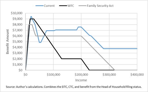 Figure 2 a and b illustrate the implications of these different design parameters. They compare the benefit structure for the current set of policies (EITC, CTC, and Head of Household tax filing status), the Family Security Act 2.0, and the WFC. Estimates suggest that both the Family Security Act 2.0 and the WFC would cost approximately $25 billion after reforming the EITC and Head of Household tax filing status. As Figure 2 shows, the main difference is that the Family Security Act 2.0 spreads out those additional costs across the income distribution; the WFC concentrates the additional spending among households with the greatest need.