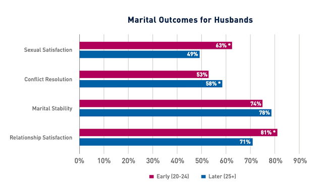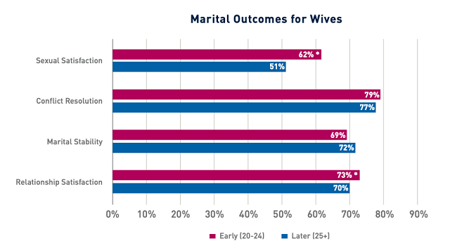 - On average, early-marrieds enjoy slightly higher marital quality than later-marrieds as measured by such outcomes as relationship satisfaction, sexual satisfaction, teamwork, and communication. Post This