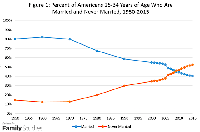 NYU Sociologist Paula England is right.1 The retreat from marriage in America began in the late 1960s, took off in the 1970s, and continues to the present day (see the figure below). It concerns jobs—good ones—and their scarcity, especially for the less-educated men and women who have experienced the biggest declines in marriage.