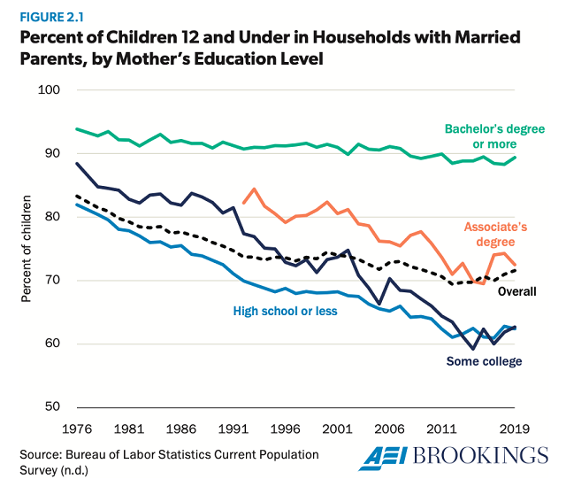 Marriage matters to children. Having married parents typically means that children live in families with more resources, including more time with their parents, and with greater stability. While these factors in themselves point to a range of improved outcomes for children, the benefits of growing up in a family with married parents is more than a sum of these parts. Yet a long, steady decline in marriage rates over the past five decades means that more children are growing up in single-parent families. Today about one in four children ages 0–12 does not have married parents. While the decline in marriage has occurred across all demographics, more than one in three children whose mother has an education level of less than a college degree does not have married parents.1