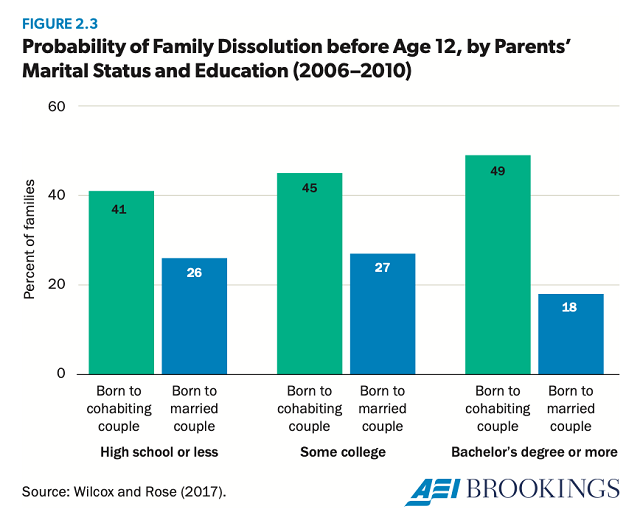 The family divide in America has many roots, but it has been largely driven by changes in our economy and in our culture that have made marriage less attainable and less required for poor and working-class Americans (Cherlin 2009; Ellwood and Jencks 2004; Wilcox, Wolfinger, and Stokes 2015; Wilson 1987). Nevertheless, this divide matters because children are, on average, more likely to thrive when they are raised in a stable, two-parent home. Compared to cohabitation, for instance, marriage in the United States is markedly more likely to bundle commitment, nonviolence, and stability (Kenney and McLanahan 2006; Musick and Michelmore 2018; Nock 1998; Wilcox and DeRose 2017). Figure 2.3, which displays the likelihood that children will see their parents break up before age 12 by parental education and marital status, shows a big gap between cohabiting and married parents (Wilcox and DeRose 2017). Other research indicates that children born to cohabiting couples who never marry are almost twice as likely to see their parents break up, compared to children whose parents are married, even after controlling for a range of confounding factors, such as parental education, race, and income (Musick and Michelmore 2018).