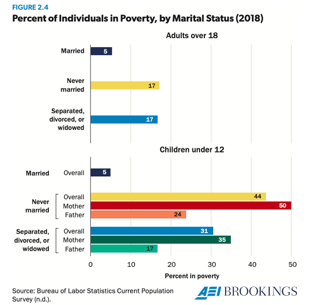 Because families that have two parents are more likely to have two earners, children in stable, married-parent families enjoy markedly higher income and lower risks of poverty and material deprivation (Lerman, Price, and Wilcox 2017). Figure 2.4 shows that children under age 12 living in single-parent homes are much more likely to be in poverty than children in married-parent families. Child poverty would be markedly reduced if the marriage rate was the same as it was in 1970 (Lerman 1996; Thomas and Sawhill 2005).