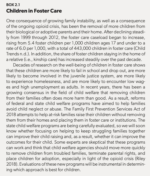 Obviously, much of the association between family structure and family income is about selection: married parents tend to be better educated and to be employed in better-paying jobs, even before they marry (Cherlin 2018). But part of the employment effect seems to be causal, as well. That is, marriage increases the odds that families have access to two earners, reduces the odds that households go through costly family transitions such as a divorce, engenders more support from kin, and fosters habits of financial prudence, including more savings (Eggebeen 2005; Lerman 2002).