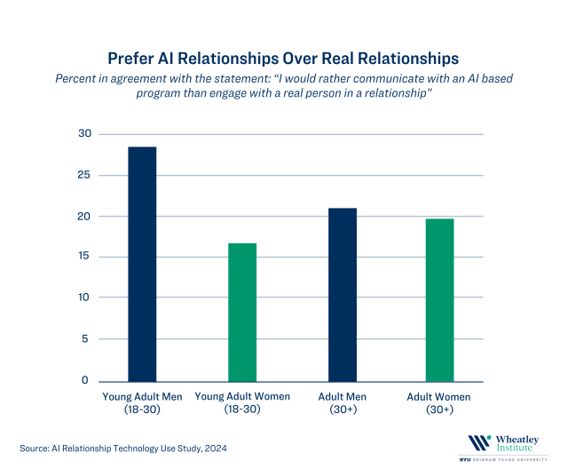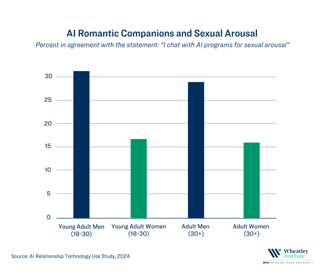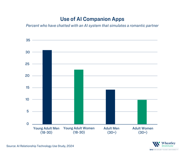 In a new report from the Wheatley Institute, we present the findings of a new study designed to explore how common it is for adults in the United States to use three types of AI relationship technologies, namely: (1) Social media platforms displaying idealized and sexualized images of women and men, (2) AI romantic companion apps that simulate romantic and sexual partners, and (3) AI generated pornography consisting of computer-generated pictures and videos.