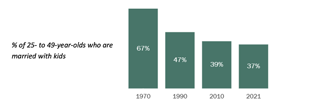 The idea of being a married father at age 22 is quite jarring to my generation. A few decades ago, it would not have been so incredible. The story of a classmate falling in love and marrying his high school sweetheart was not out of the norm for many Americans. Now, it certainly raises eyebrows, with fewer young Americans choosing to gettg married and having kids, as illustrated by the following figure from Pew Research Center.