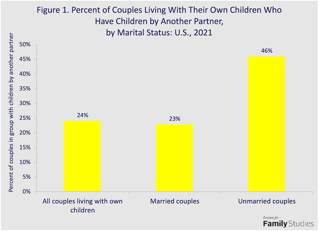 Divided loyalties are twice as common among unmarried as married parents, as shown in Figure 1. In fact, 46% of unmarried couples in 2021 had previous children by other partners, 2 versus 23% of married couples.3