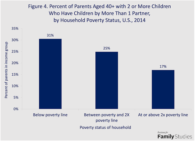 Of all parents aged 40 plus who had children by multiple partners, 15% were living below the poverty line and 20% were between poverty and twice the poverty line. By comparison, parents in the same age group with two or more children who had all their children with only one partner, 8% were living in poverty, and 15% were between poverty and twice the poverty line.8