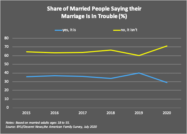 While some couples are struggling, the majority of husbands and wives report that their marital unions are stronger in 2020. According to the American Family Survey (AFS), a new survey of American families conducted by Deseret News/Center for the Study of Elections and Democracy, 58% of married men and women 18-55 said that the pandemic has made them appreciate their spouse more, while 51% of husbands and wives said their commitment to marriage had deepened. Furthermore, the AFS found that the share of married people reporting their marriage is in trouble fell from 40% in 2019 to 29% in 2020, as the figure shows below.
