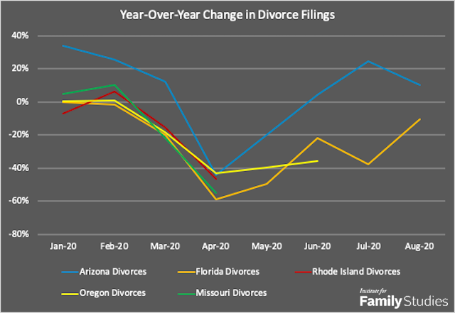 Despite media reports suggesting otherwise, the initial state data we have indicates a decline in divorce filings for 2020, with year-to-date divorce filings down 19% in Florida, 9% in Missouri, 12% in Oregon, and 13% in Rhode Island. As the figure below shows, there's been a marked decline in divorce during the COVID months (these are the five states for which data is available).