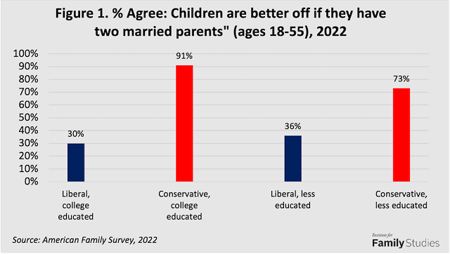 For instance, from 2006 to 2020, the share of adults who said that it is “important” for unmarried couples who have had a child together to “legally marry” fell from 76% to 60%,1 as did the share of adults who say divorce is “unacceptable.”2 The 2022 American Family Survey indicates that college-educated liberals are especially likely to discount the value of marriage for children. Specifically, among adults ages 18 to 55, only 30% of college-educated liberals said that children are “better off” with married parents, the lowest share of any group in the survey. By contrast, 91% of college-educated conservatives think that children are better off if they have married parents. But because a majority of college-educated Americans lean left, the drift among more well-educated men and women in the United States has been towards the view that marriage is not important for children.