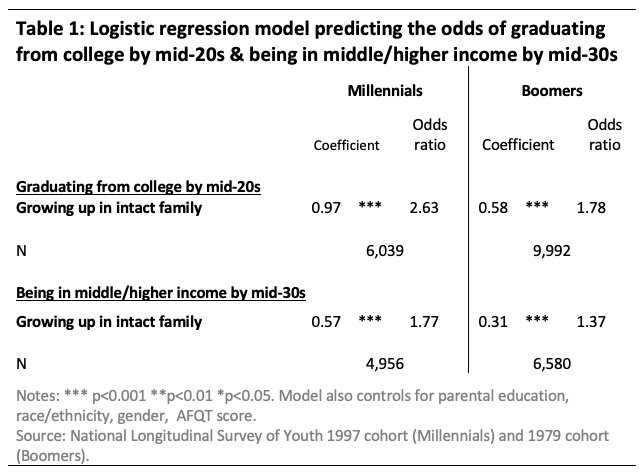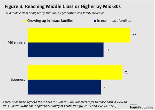 After controlling for socioeconomic factors, Millennials’ odds of being in the third highest income bracket in their 30s are 77% higher for those who grew up in an intact family with both biological parents. For Boomers in their 30s, growing up in an intact family boosted their odds of being affluent by 42 percent.