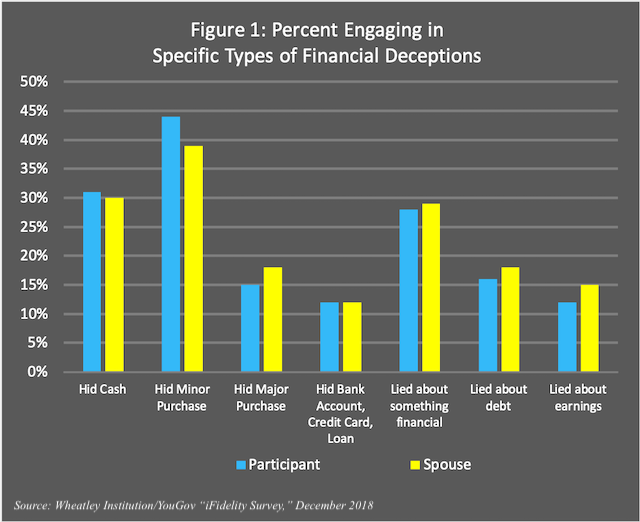 - More than half (58%) of iFidelity survey respondents reported financially deceiving their spouse, while 51% reported that their spouse had financially deceived them. Post This
