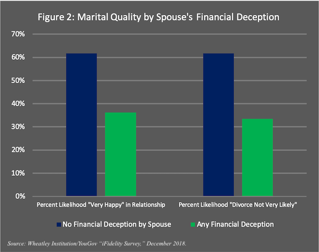 But whether minor or more serious in nature, we found that any financial deception in marriage was related to marital quality and happiness. While 62% of respondents who did not report any financial deception from their spouse were likely to be very happy in their marriage, only 36% of respondents who reported that their spouse had financially deceived them in some way were likely to be very happy. They were also much less confident that divorce was not likely for their marriage: only 33% of those who reported financial deception thought divorce was unlikely compared to 62% of those who reported no financial deception.
