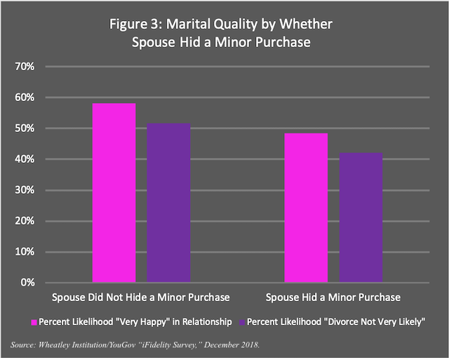 As expected, more serious forms of deception predicted greater challenges for marital quality. But even minor forms of deception were related. Respondents who reported their spouse hiding minor purchases from them were 9 percentage points less likely to say that they were very happy in their marriage, and 10 percentage points less likely to say that divorce was unlikely compared to those whose spouses had not hidden minor purchases from them.