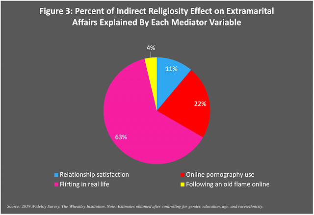 Figure 3 suggests that one of the main ways in which religion may prevent extramarital affairs is by preventing individuals from flirting with a member of the opposite sex (i.e., who is not their spouse) in the first place. Given that flirting often signals romantic and/or sexual interest to a potential partner, religion might “build a wall” around marital fidelity by reducing this activity. Religion might also make infidelity less likely by reducing individuals’ use of pornography—an activity that research has been shown to be associated with extramarital affairs.