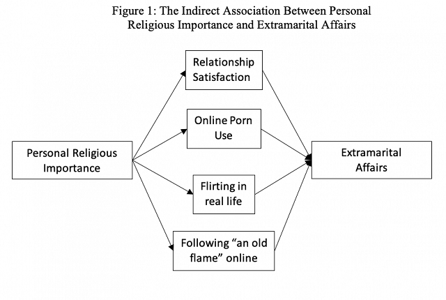 One of the ways in which religiosity may reduce the likelihood of extramarital affairs is by reducing those behaviors that may escalate into full blown sexual infidelity. Extramarital affairs rarely occur in a day but progress over time—extramarital sexual behavior often starts with instances of “lesser” relationship infidelity that are not necessarily sexual in nature.5 This could include things like following an ex-partner on social media,6 flirting with someone in real life,7 and online pornography consumption.8