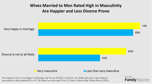 Women also were happier in marriages where they gave their husbands high marks for masculinity. Wilcox’s study found that 74% of wives who say they are “very happy” in their marriage, also rate their husband as “very masculine.” And nearly two-thirds (64%) of wives who say their husbands are very masculine also say that divorce is not at all likely.