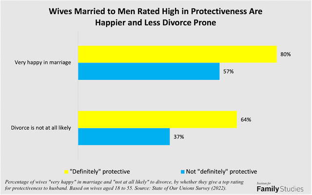Protectiveness is a sign of masculinity, and whether or not progressive young women today will admit it, both masculinity in general—and protectiveness in particular—are very attractive in a mate—even in 2024. And it’s something Brad Wilcox says women appreciate in a husband. In the State of Our Unions survey, wives who gave their husbands’ top rating for “protectiveness” were more likely to be happy in their marriages and less likely to report that divorce might be in their future.