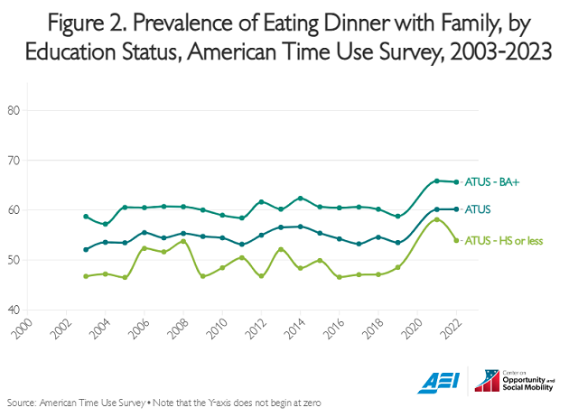 Finally, Figure 2 shows trends from 2003 to 2022 from another data source, the American Time Use Survey (ATUS). The ATUS records time diary entries for a representative group of Americans, offering researchers a definitive portrait of how, with whom, and where individuals spend their time. It also reduces recall bias, as respondents are asked about their activities the previous day. We show the share of Americans with children that eat dinner at home with at least one family member on any given night.3