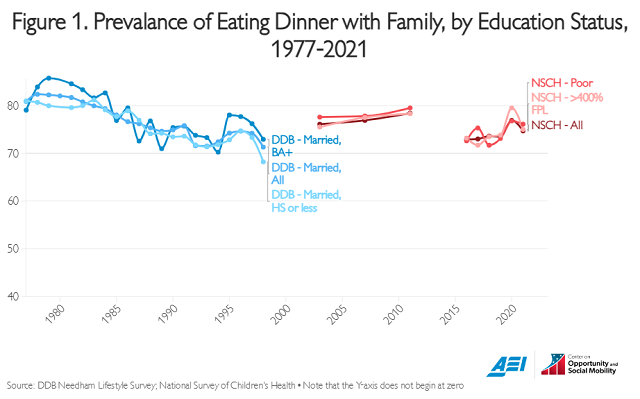 In his influential book, Our Kids, Putnam noted, “from the mid-1970s to the early 1990s...family dinners became rarer in all social echelons, as families struggled to manage the new scheduling complexities of having two working parents.” Using data from the DDB Needham Life Style Survey, which is conducted annually from 1975 to 2005, he showed that the share of Americans who agree with the statement, “Our whole family usually eats dinner together,” fell from roughly 80 to 70 percent.