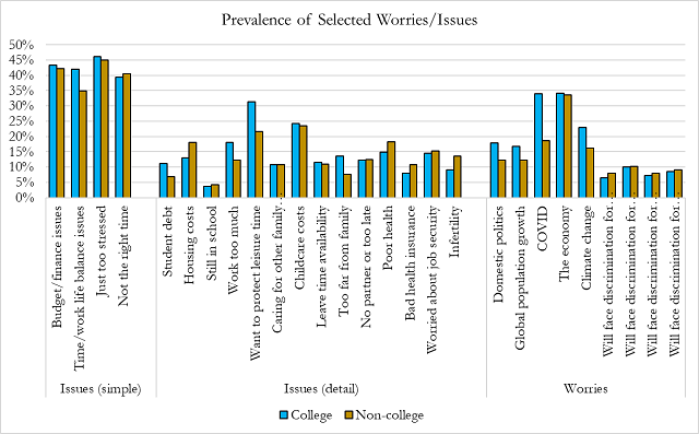 Surveys suggest a smattering of factors, with no one thing rising to the top as the only answer. Financial issues, time and work/life balance issues, health, and stress are all reported. Though answers are generally similar across class lines, there are some interesting differences. In one data set of 10,000 respondents ages 25-44, pictured below, college-educated respondents were more likely to say that time and work/life balance issues—things like wanting to protect leisure time, working too much, and being too far from family—impacted their family plans. Non-college-educated respondents were more likely to name housing costs and bad health insurance, poor health, and infertility as barriers to fertility.