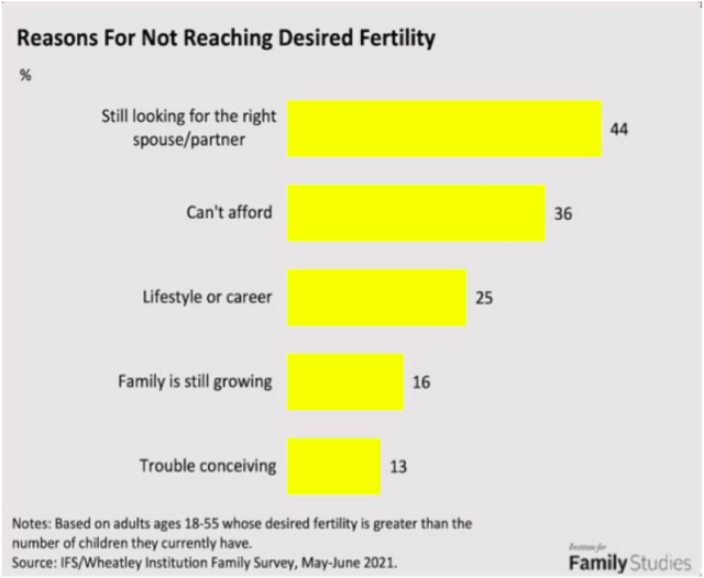 Indeed, evidence suggests that marriage rates and timing play a key part in the story of fertility decline. A 2022 IFS research brief reported that the top reason given for not reaching desired fertility is “still looking for the right partner.”