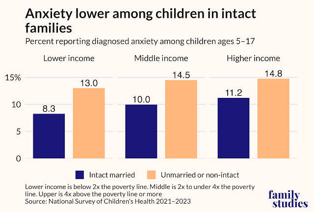 The story about anxiety is similar. Children from intact families have lower rates of diagnosed anxiety than their peers across income brackets. For those from wealthier households, 11.2% of children in intact families have diagnosed anxiety, whereas 14.8% report diagnosed anxiety among those hailing from unmarried or non-intact households.