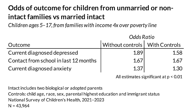 Of course, there are other factors that contribute to outcomes like depression, anxiety, and school issues beyond income and family structure. But we find that these differences hold up even with controls. Specifically, when we add age, race, sex, parental education and immigrant status controls, we find that among children from wealthier households, those with unmarried or non-intact families are 58% more likely to be depressed, 30% more likely to be diagnosed with anxiety, and 67% more likely to have had recent school contact.