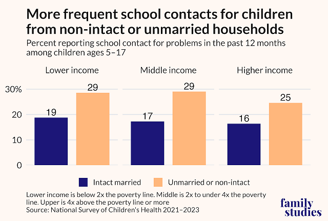 The differences between intact and non-intact households are also reflected in child learning or behavior problems at school. A quarter of children from wealthier, non-intact or unmarried households have had their school contact home for some problem in a given year. This compares to 16% of children in wealthier, intact married households.