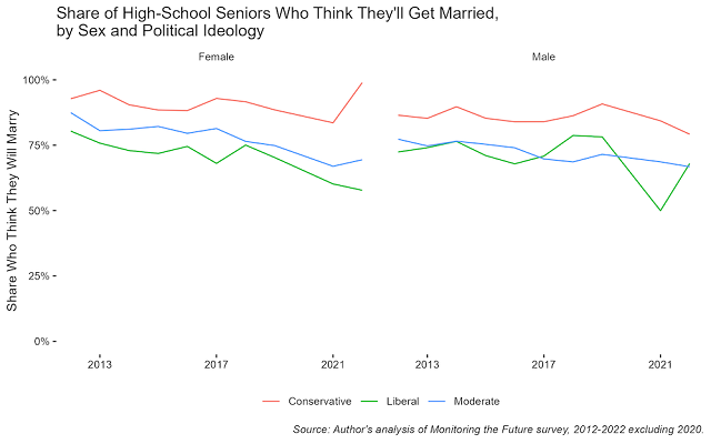 2. For example, in 2022, only 711 people answered whether they thought they’d get married, which in the chart gets divided into two sexes and three political ideologies each, with only 42 conservative women, a mere one of whom didn’t think she’d get married.