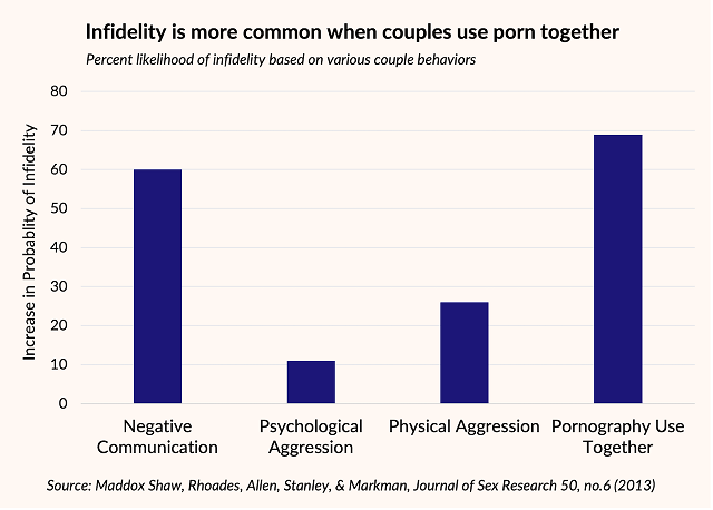 Other research has suggested a similar pattern where pornography use diminishes commitment to one’s partner. For example, several studies have noted that pornography use is associated with more positive attitudes toward extramarital affairs and the likelihood of it happening. The figure below shows the results of one study that found that using pornography together was a stronger predictor of infidelity than physical aggression, psychological aggression, and negative communication in the relationship.