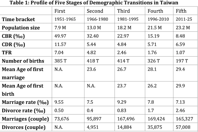 With these socio-economic and political factors in mind, I grouped Taiwanese demographic transitions into five stages for the period from 1951 to 2025. Each stage covers 15 years of the time frame (see Table 1 in the Appendix). I discuss the fourth and fifth stages in relative detail because of the demographic challenges happening in the new century.