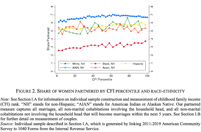 The authors also run a few counterfactual simulations. As work from Raj Chetty has also found, there isn’t much of a gap in personal income between white and black women who had the same family income in childhood (i.e., they are similarly economically mobile)—so eliminating that gap makes only a small difference. By contrast, the mobility gap shrinks by 85% when their partner incomes are equalized.