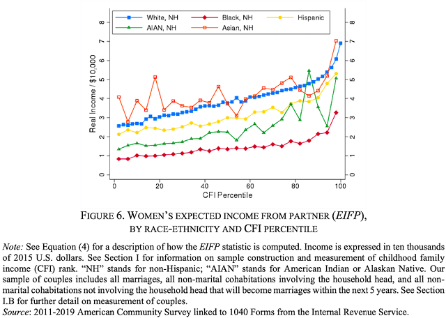 Their key statistic is called the “Expected Income from Partner” (EIFP): If a woman grew up with a certain family income, and is from a certain racial group, how much income can she expect, on average, to gain from a romantic partner?