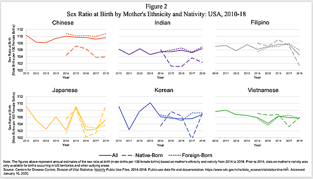 But abnormally high SRBs appear to be delimited in the US to foreign-born populations hailing from countries beset by that same problem today. While we cannot be conclusive about this matter, we do not find evidence of such SRB imbalances among Asian-Americans born in the USA. One explanation for such a distinction in SRBs would be that assimilation and acculturation are helping to bring this concerning practice to an end. That is not be the only possibility, but it is a plausible and rather hopeful one.