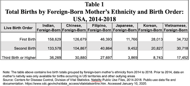 If we posit a hypothetical “norm” of 105 for the “natural” SRB for foreign-born mothers, the data in Table 1 would imply over 1,700 “missing” births of newborn girls between 2014 and 2018 among third and higher-parity deliveries for foreign-born mothers of Indian ethnicity. By the same token: such calculations would hypothesize over 6,700 “missing” newborn American girls to foreign-born, Chinese mothers between 2014 and 2018 (summing all birth orders). By such an illustrative reckoning, the scale of the “missing female newborn” group in these two sub-populations would have been on the order of 8,400 for 2014 to 2018 alone. The obvious inference is that many thousands of baby girls were “missing” due to parental interventions: i.e. sex-selective abortion—though it is equally obvious that we have no means of telling exactly how many sex-selective abortions took place among these groups over those same years, much less in which countries or states such procedures would have taken place.